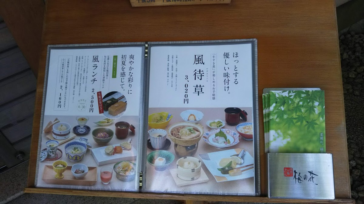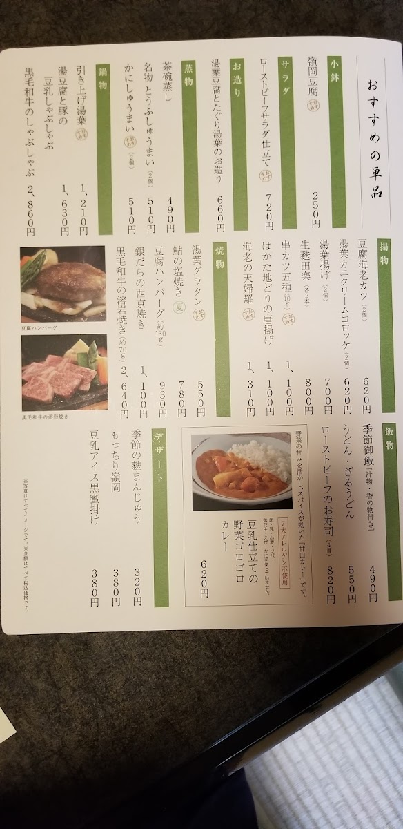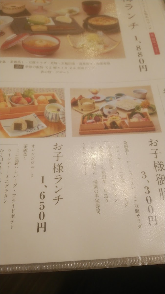 【Mineoka tofu】 Tofu like made from milk, fresh cream and arrowroot starch. Yuba-ni 【Cold yuba】【Chawan-mushi】 Cup of steamed egg custard containing shrimp, mushrooms, small rice cake and ginkgo nut. 【Tofu salad】 Tofu salad. 【Meibutsu tofu shumai】 Tofu Siomai 【Renkon-manjyu】 Lotus root dumplings with fish soup stock sauce. 【Yu-tofu】 Boiled tofu. 【Namafu dengaku】 Deep fried wheat gluten coated with miso paste. Yuba-age. Deep fried yuba roll with ground whitefish. 【Yuba Suimono】 Yuba clear soup. 【Kisetsu no hanmono】 Seasonal rice. 【Japanese pickled vegetables】 【Dessert】