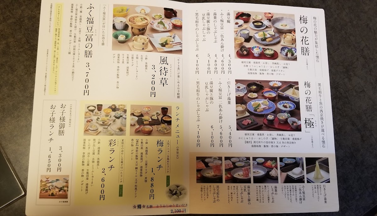 From a reviewer’s perspective, the menu at Umenohana Oita offers a refined and well-structured journey through traditional Japanese kaiseki dining, with a strong emphasis on balance, seasonality, and presentation. The highlight is the selectable hot pot creative kaiseki series, where 梅の花懐石「極」-きわみ- ¥5,900~(price varies by hot pot) delivers a premium, multi-course experience suited for special occasions, while 梅の花懐石 ¥4,700~(price varies by hot pot) provides a more accessible yet equally thoughtful alternative. For midday diners, the weekday lunch selection is particularly appealing, featuring IRODORI LUNCH ¥2,800, which offers excellent value and visual variety, and the reservation-only SAISHOKU LUNCH(vegan lunch)¥3,800, a clear indication of the restaurant’s commitment to plant-based cuisine. This philosophy continues into the dinner offerings, with the UMENOHANA KAISEKI ¥4,700~ and the more elaborate UMENOHANA KAISEKI KIWAMI ¥5,900~, both showcasing Umenohana’s signature tofu-based dishes and delicate Japanese flavors. Notably, vegan diners are thoughtfully catered to through the reservation-only SAISHOKU KAISEKI(vegan kaiseki)¥5,800, which stands out for its creativity and depth despite the absence of animal products. Overall, the menu feels cohesive and intentional, successfully combining traditional aesthetics with modern dietary awareness, making Umenohana Oita a compelling choice for both casual lunches and elegant, memorable dinners.