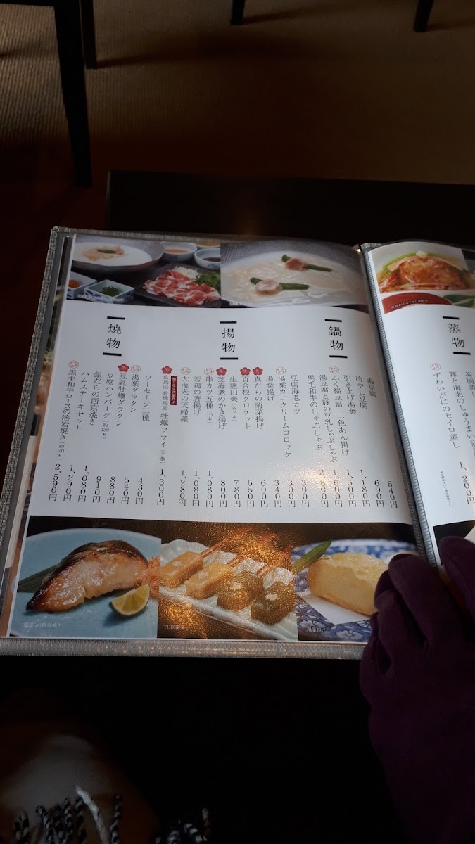 【Mineoka tofu】 Tofu like made from milk, fresh cream and arrowroot starch. 【Sashimi(Tuna and Yam)】 【Chawan-mushi 】 Cup of steamed egg custard containing shrimp, mushrooms, small rice cake and ginkgo nut. 【Yuba-tofu to taguri-yuba no otsukuri】 Sashimi ( Yuba tofu and Fresh yuba ) 【Crab meat siomai】 【Renkon manjyu】 Lotus root dumplings with fish soup stock sauce. 【①Hikiage yuba 】 【②Hikiage yuba change to fuku fuku tofu add 200 yen】 【③Hikiage yuba change to pork slice shabu shabu add 900 yen.】 【④Hikiage yuba change to Japanese black beef slice shabu shabu add 1,900yen】 【Namafu dengaku】 Deep fried wheat gluten coated with miso paste. 【Yuba-age】 Deep fried yuba roll with ground whitefish. 【Choice 】 ①Kuroge wagyu no yoganyaki Two pieces of Japanese beef steak grilled on a hot stone plate. ②Gindara no saikyoyaki Grilled sablefish fillet with saikyo miso paste. 【Clear Yuba soup】 【Cooked rice】 【Japanese style pickled vegetables.】 【Dessert】
